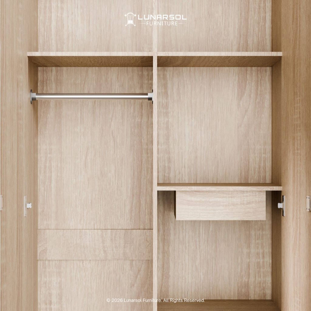 Jelajahi koleksi kami yang serupa dengan gaya Japandi, seperti di halaman lemari pakaian Japandi Oak Muda. Lemari pakaian 2 pintu cermin full body ini dilengkapi dengan pintu cermin yang luas, ideal untuk memudahkan Anda bersiap-siap dan secara visual membuat ruangan terasa lebih lega.
