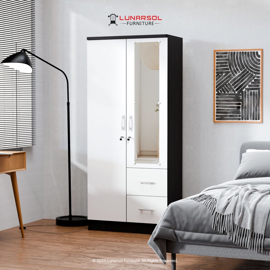 Lemari pakaian 2 pintu laci cermin LUNARSOL LPT 016 adalah solusi penyimpanan yang modern dan fungsional. Desainnya yang minimalis dengan perpaduan warna Hitam dan Putih menciptakan tampilan kontras yang elegan, cocok untuk kamar tidur dengan gaya modern. Dibuat dari material kayu berkualitas tinggi, lemari ini kokoh dan tahan lama.