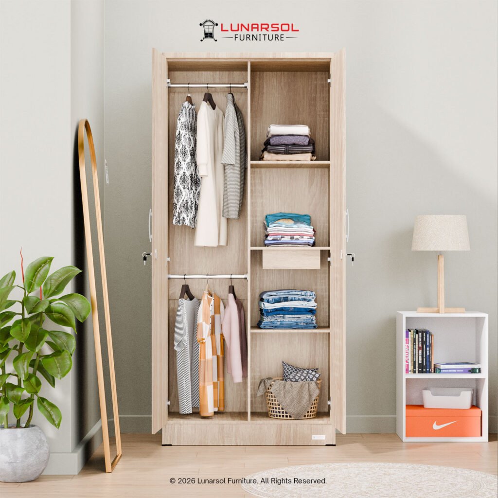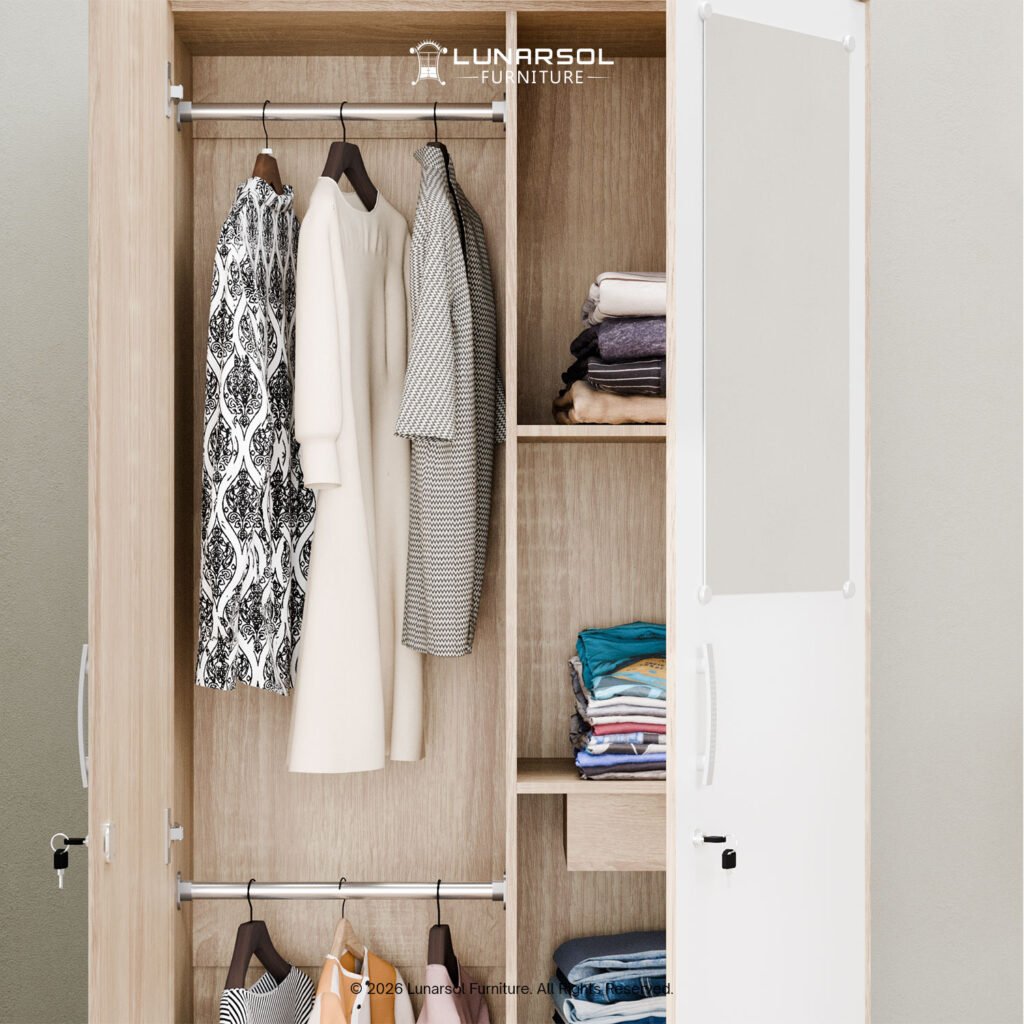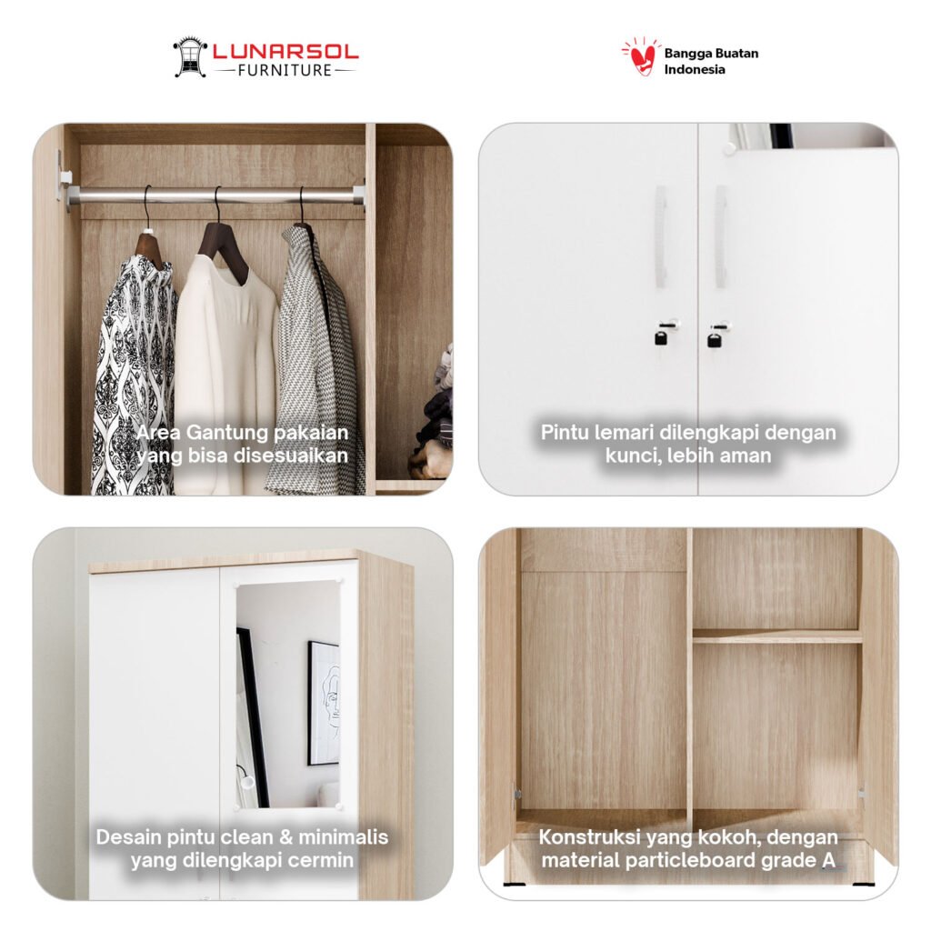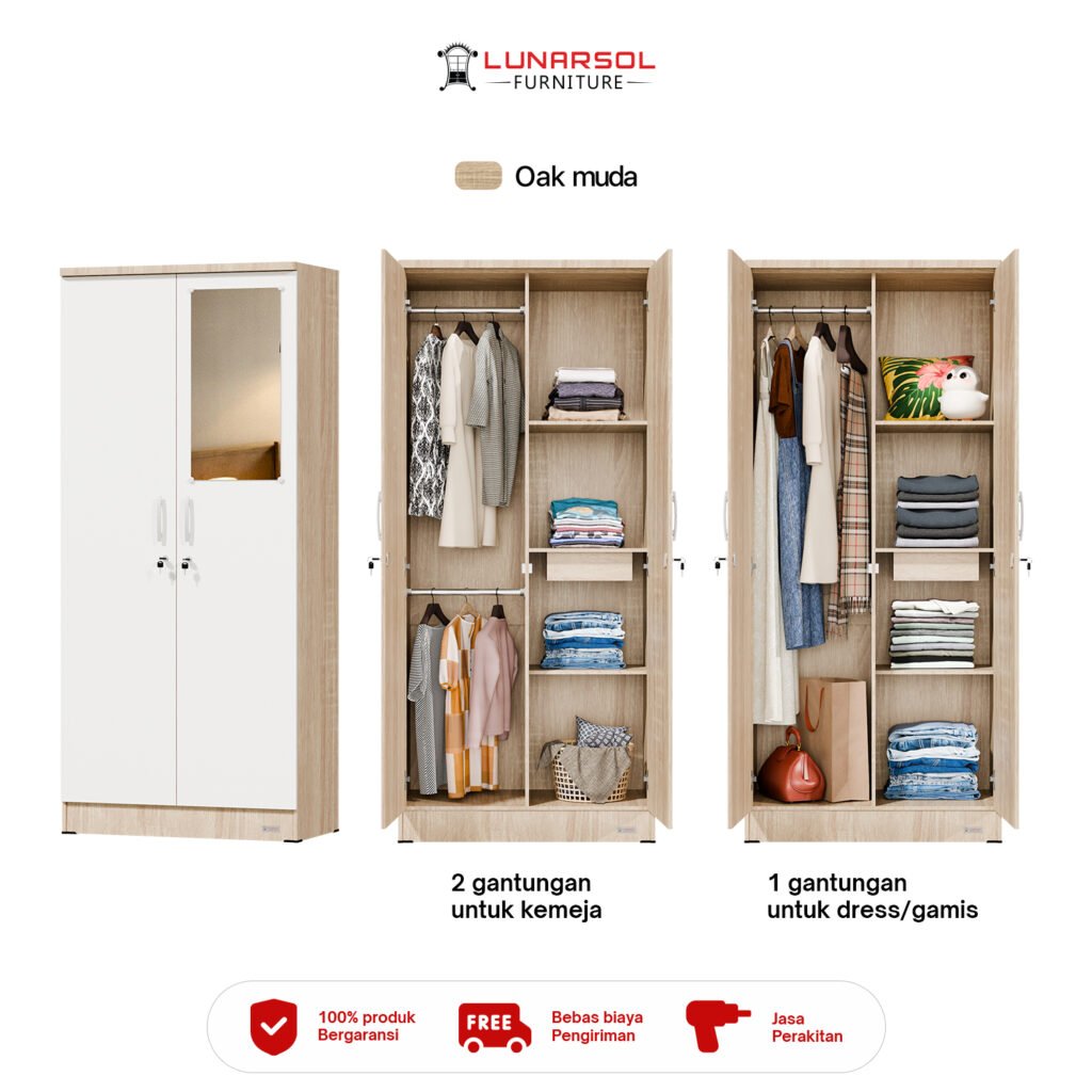 Optimalkan penyimpanan pakaian Anda dengan lemari pakaian 2 pintu ruang gamis LUNARSOL LPT 012 2G. Dirancang dengan konsep fleksibel dan praktis, lemari ini menawarkan solusi penyimpanan yang dapat disesuaikan untuk berbagai jenis pakaian. Dibuat dari material kayu berkualitas tinggi, lemari ini menjamin kekuatan dan ketahanan. Desain minimalisnya dengan perpaduan warna Oak Muda White memberikan sentuhan elegan dan cerah.