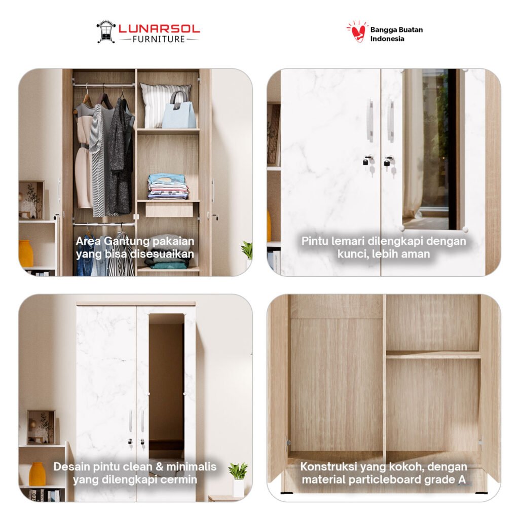 Perbarui kamar Anda dengan lemari pakaian gamis motif LUNARSOL LPT 030 2G. Lemari 2 pintu ini memadukan desain modern yang fungsional dengan tampilan mewah. Kombinasi motif marble yang elegan dengan aksen Oak Muda yang hangat menciptakan suasana menawan di setiap ruangan. Dibuat dari Particle Board Grade A berkualitas ekspor, lemari ini menjamin kekuatan dan durabilitas jangka panjang.