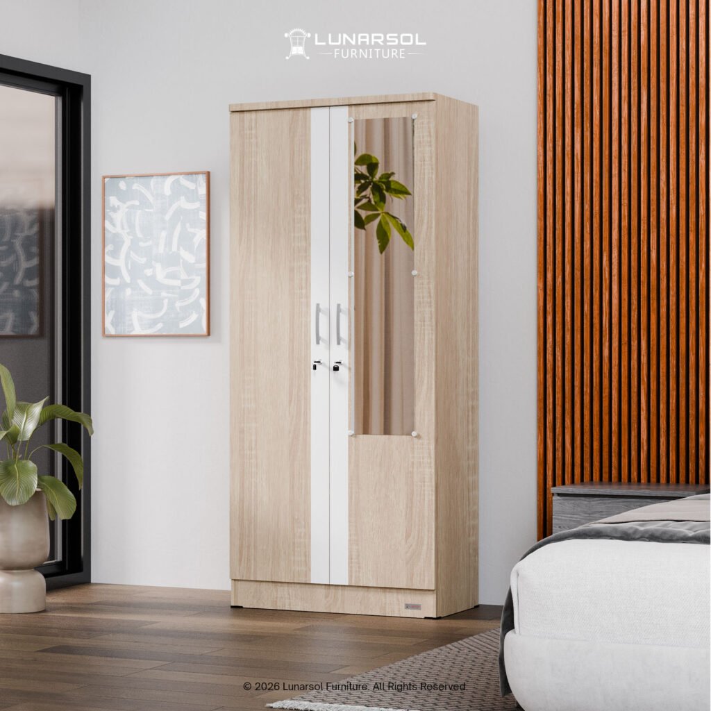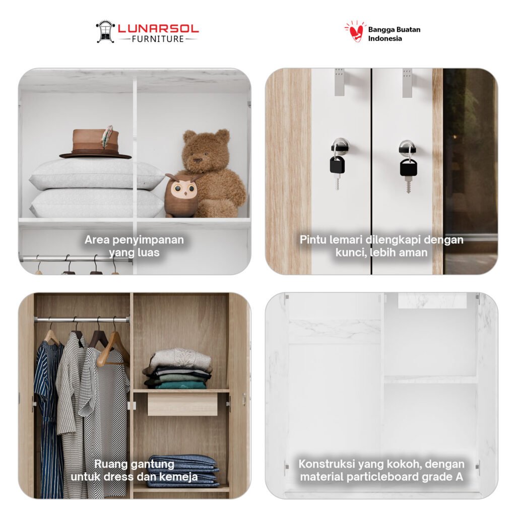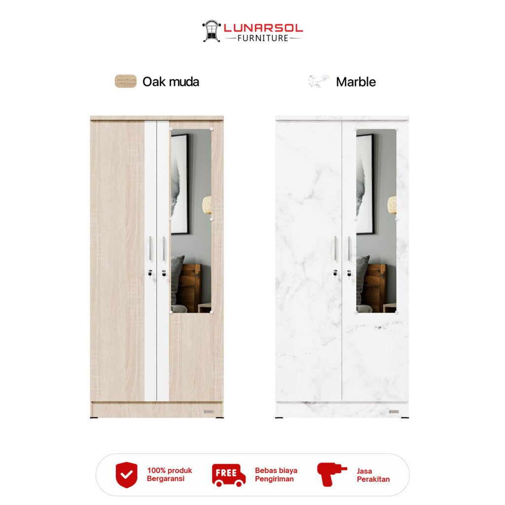 Optimalkan ruang Anda dengan lemari pakaian minimalis 2 pintu LUNARSOL LPT 011. Lemari ini memadukan desain modern yang elegan dengan fungsionalitas maksimal, menjadikannya solusi ideal untuk ruangan dengan dimensi terbatas. Dibuat dari material kayu berkualitas tinggi, lemari ini kokoh dan tahan lama. Desainnya yang minimalis dengan perpaduan warna Oak Muda White dan Marble memberikan sentuhan mewah pada kamar Anda.