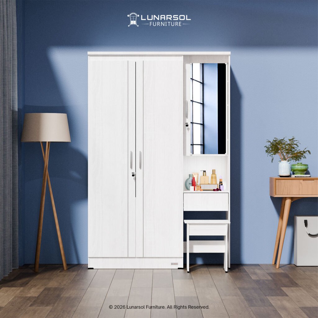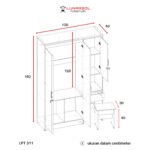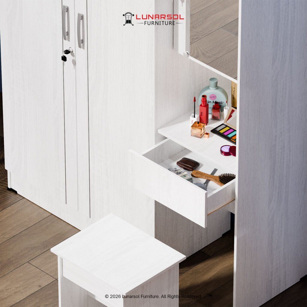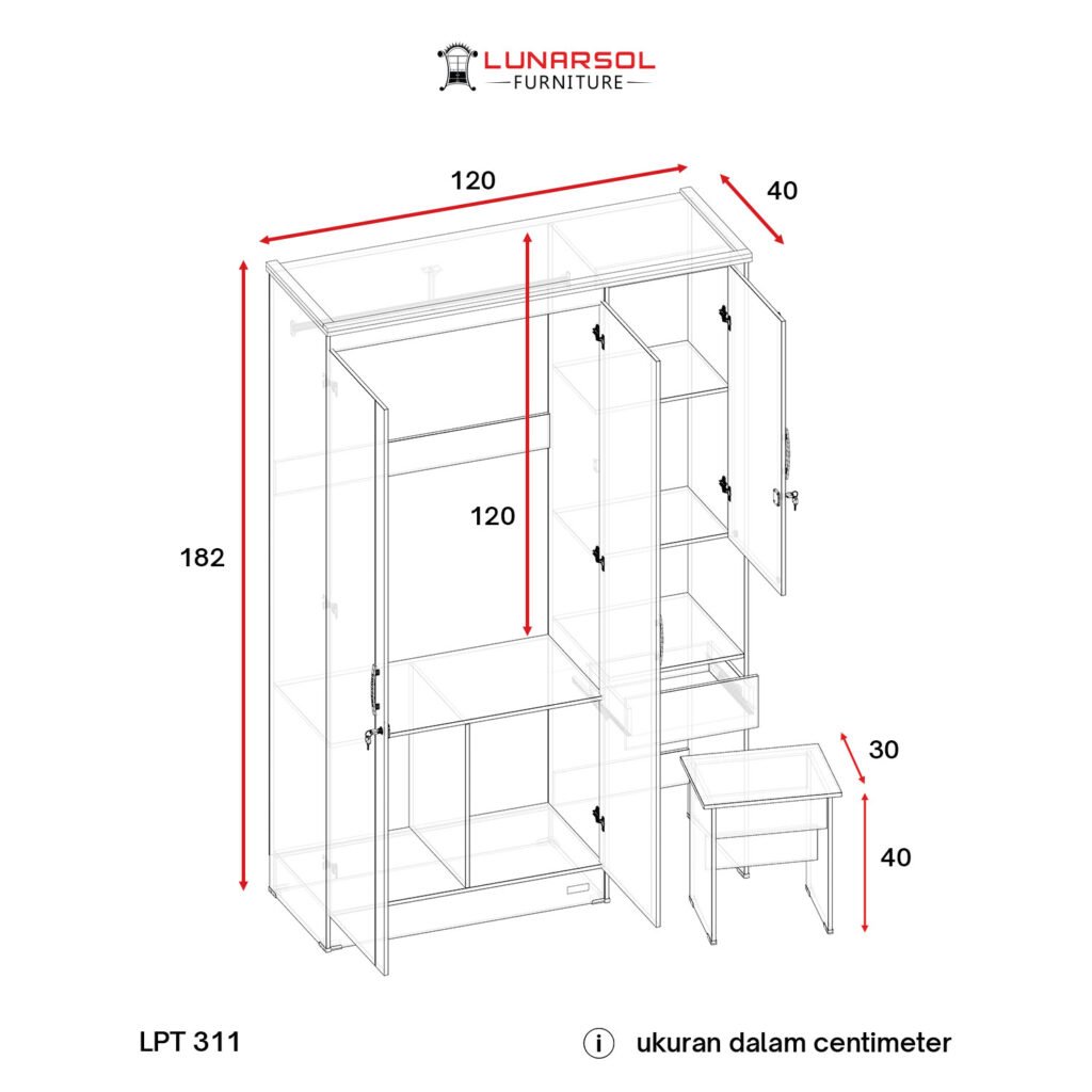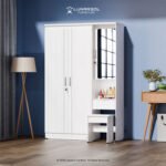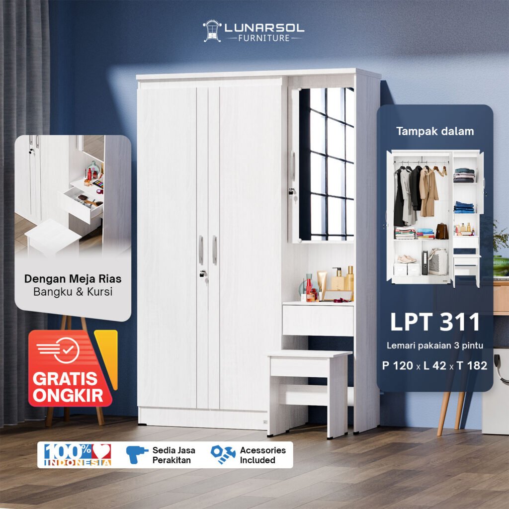 – Dimensi (P x L x T): 120 cm x 42 cm x 182 cm (Lemari), 30 cm x 40 cm x 40 cm (Bangku Meja Rias)