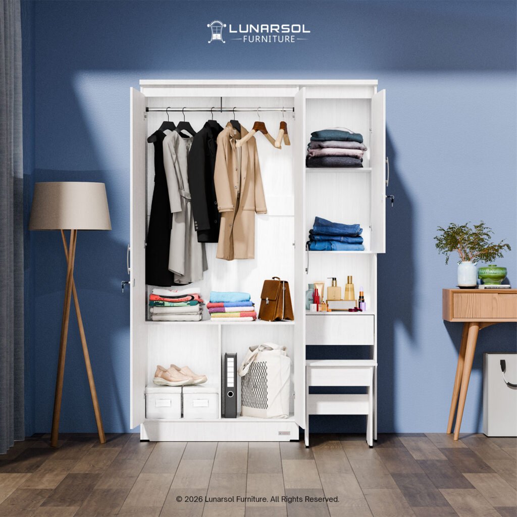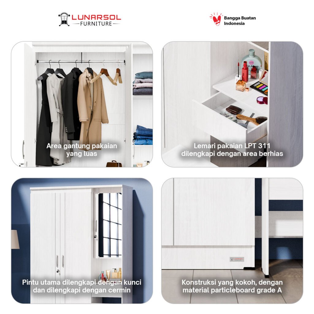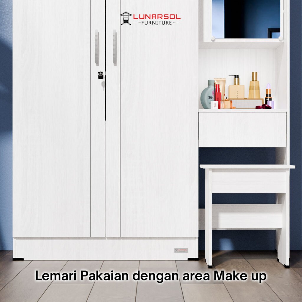 Optimalkan ruang kamar tidur Anda dengan Lemari Pakaian 3 Pintu Lunarsol LPT 311. Lemari serbaguna ini tidak hanya menyediakan ruang penyimpanan pakaian yang luas dengan area gantung dan rak multifungsi, tetapi juga dilengkapi dengan meja rias terintegrasi, cermin, laci penyimpanan, dan bangku yang ringkas. Dengan desain minimalis modern dalam finishing Sonoma White, LPT 311 terbuat dari material Particle Board Grade A berkualitas tinggi yang tersertifikasi Jepang, menjamin kekuatan dan durabilitas. Cocok untuk Anda yang mencari solusi penyimpanan lengkap dan fungsional dengan sentuhan elegan.