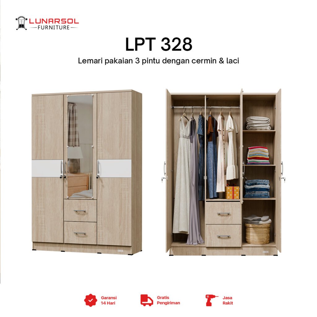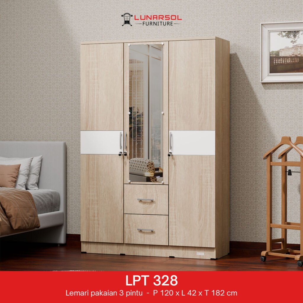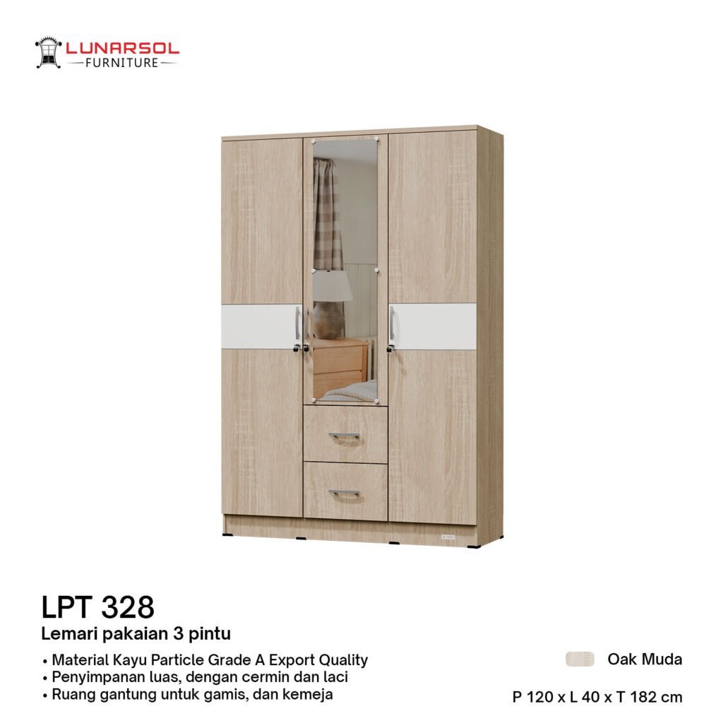 Maksimalkan ruang penyimpanan Anda dengan Lemari Pakaian LPT 328 dari Lunarsol Furniture. Dirancang dengan desain modern minimalis yang elegan dan sentuhan warna Oak Muda yang menawan, lemari 3 pintu ini dilengkapi cermin fungsional serta laci penyimpanan luas untuk menata pakaian, aksesoris, dan barang pribadi lainnya dengan rapi. Dibuat dari material kayu particle board Grade A berkualitas ekspor, Lemari Pakaian LPT 328 tidak hanya menawarkan fungsionalitas optimal tetapi juga kekuatan dan daya tahan yang luar biasa, menjadikannya pilihan sempurna untuk melengkapi estetika dan kebutuhan penyimpanan kamar tidur Anda.
