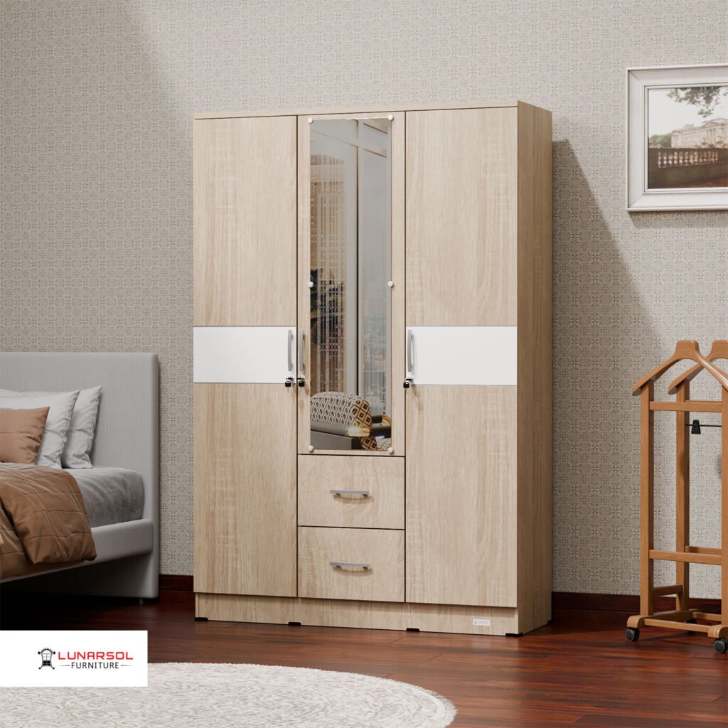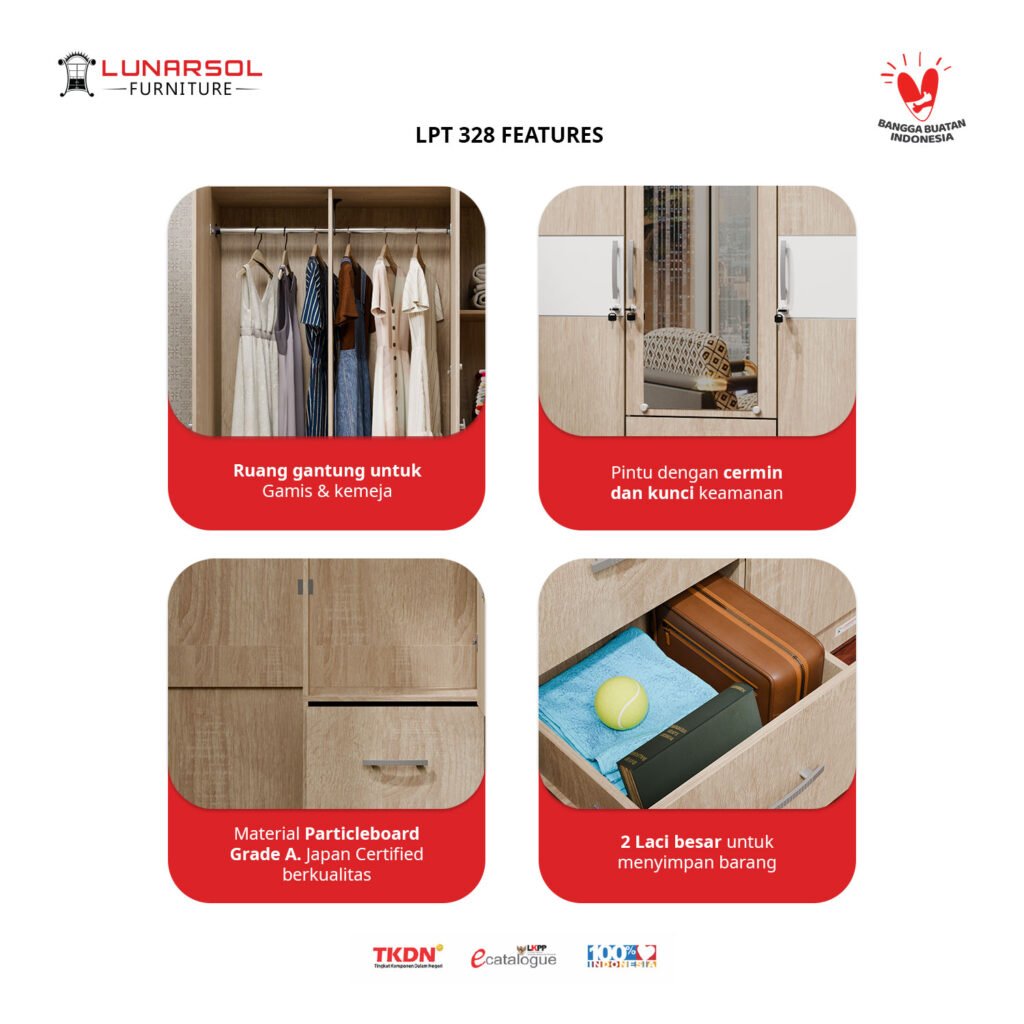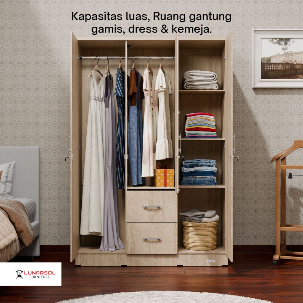 Maksimalkan ruang penyimpanan Anda dengan Lemari Pakaian LPT 328 dari Lunarsol Furniture. Dirancang dengan desain modern minimalis yang elegan dan sentuhan warna Oak Muda yang menawan, lemari 3 pintu ini dilengkapi cermin fungsional serta laci penyimpanan luas untuk menata pakaian, aksesoris, dan barang pribadi lainnya dengan rapi. Dibuat dari material kayu particle board Grade A berkualitas ekspor, Lemari Pakaian LPT 328 tidak hanya menawarkan fungsionalitas optimal tetapi juga kekuatan dan daya tahan yang luar biasa, menjadikannya pilihan sempurna untuk melengkapi estetika dan kebutuhan penyimpanan kamar tidur Anda.