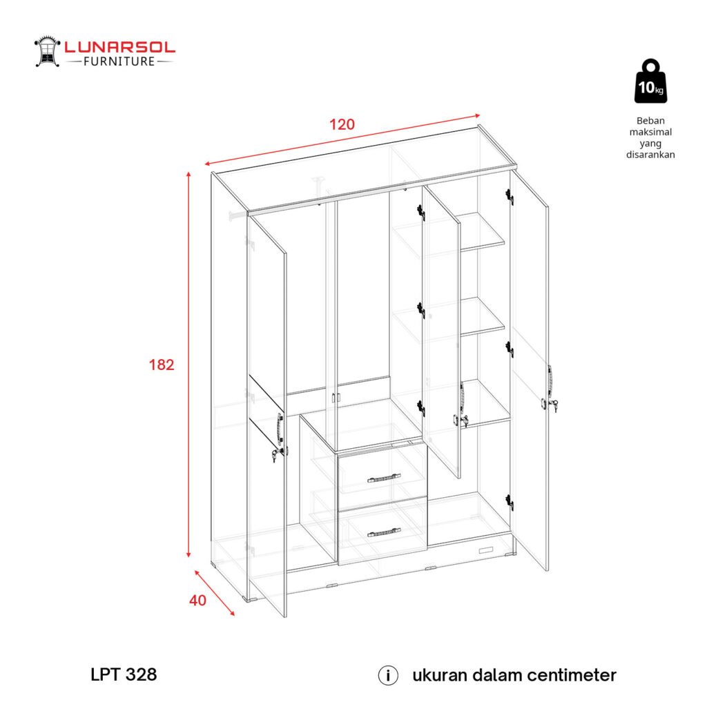 – Dimensi: P 120 x L 40 x T 182 cm