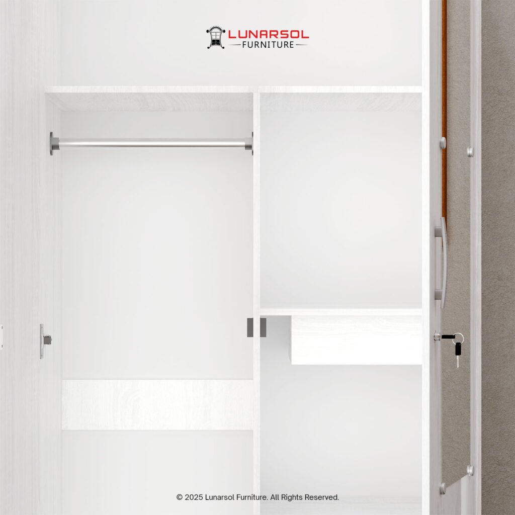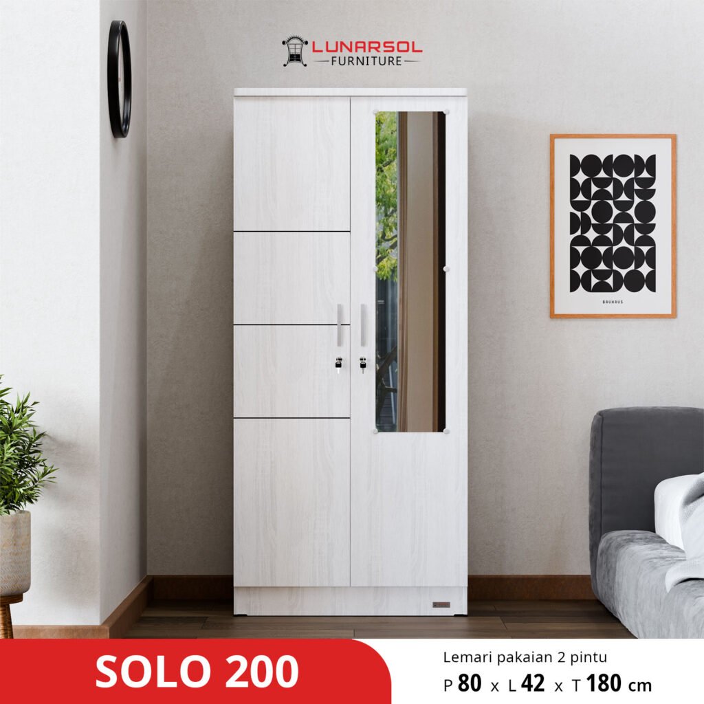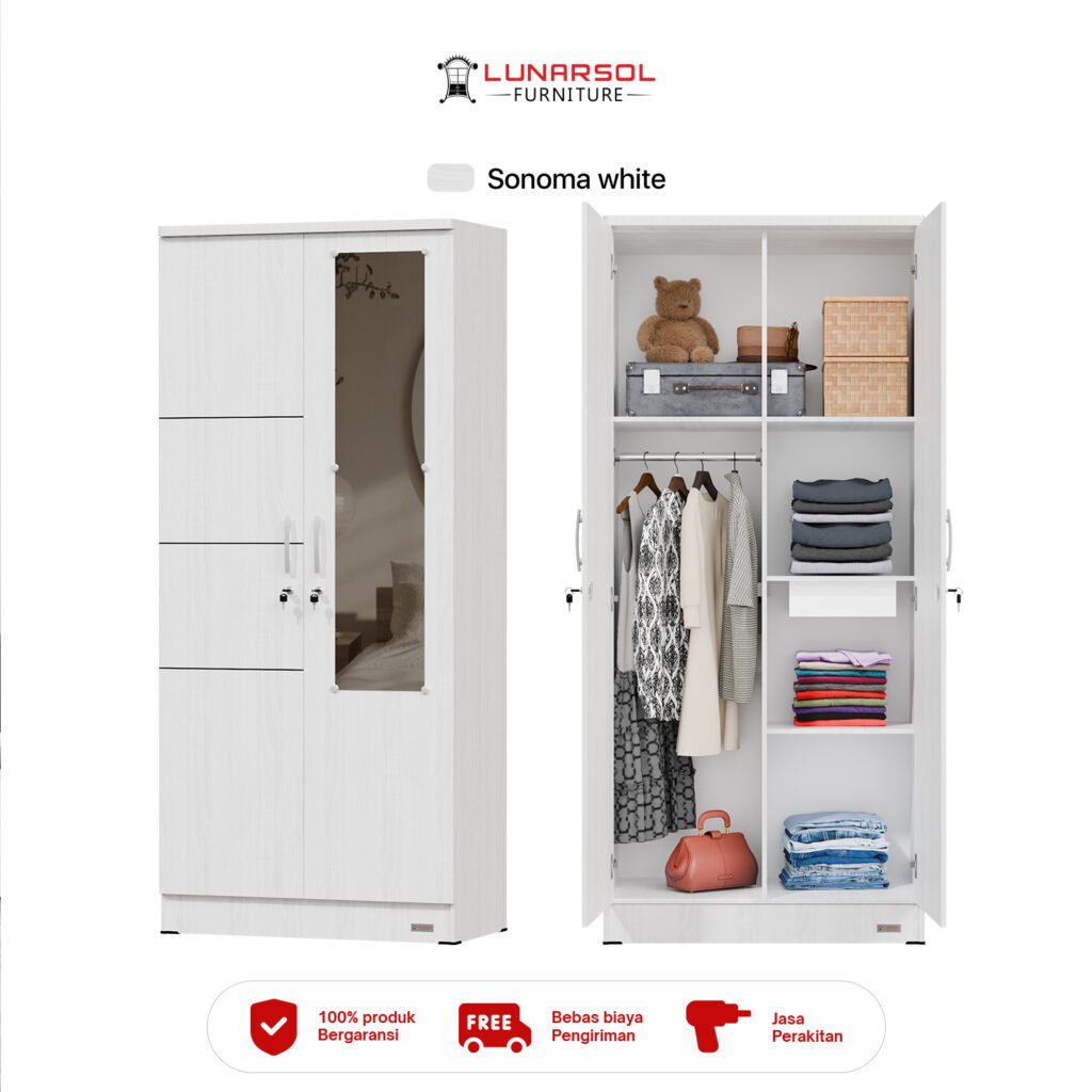 Sempurnakan kamar tidur Anda dengan Lemari Pakaian 2 Pintu Cermin Minimalis Modern SOLO 200. Desain simpel dan elegan dengan warna Sonoma White memberikan kesan bersih dan modern pada ruangan. Lemari ini dilengkapi dengan cermin berukuran proporsional pada salah satu pintunya, memudahkan Anda dalam berpenampilan sehari-hari. Interior lemari dirancang untuk penyimpanan yang efisien dengan ruang utama yang luas, ruang gantungan, rak serbaguna, dan laci penyimpanan. Terbuat dari material kayu olahan berkualitas, SOLO 200 menawarkan kekuatan dan daya tahan untuk penggunaan jangka panjang.