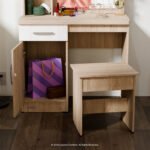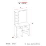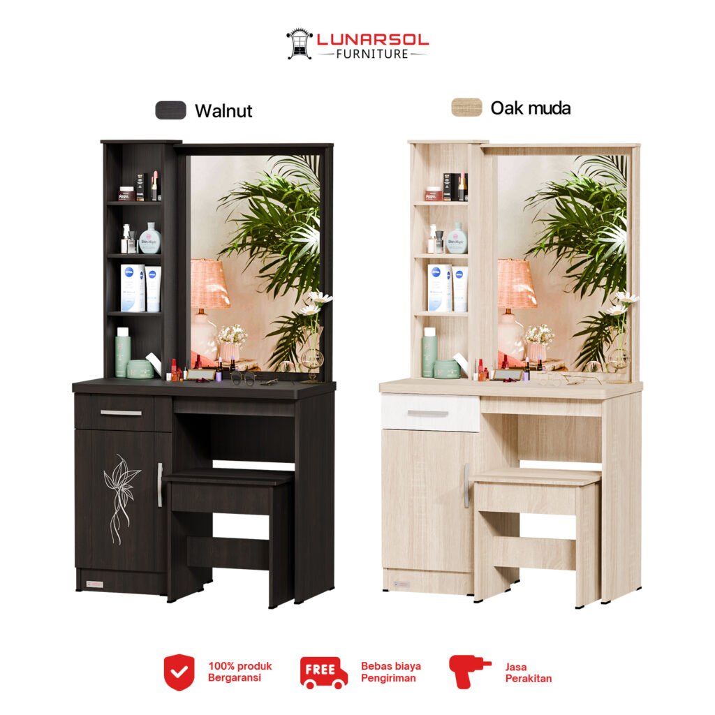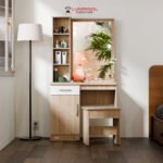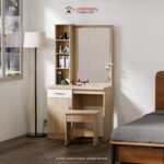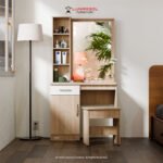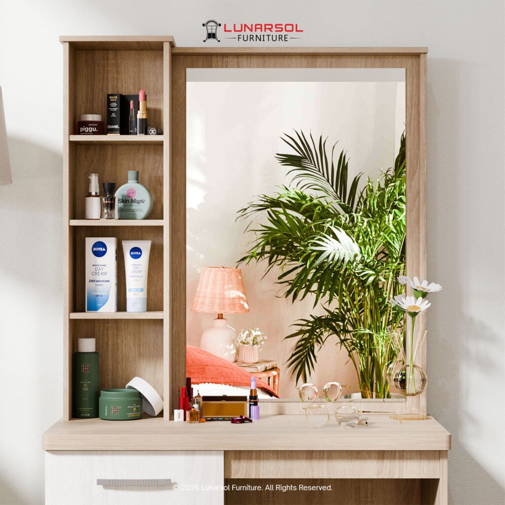 – Kegunaan atau Penempatan: Ideal sebagai meja rias di kamar tidur, area persiapan diri, atau sudut fungsional untuk menyimpan kosmetik, perhiasan, dan barang pribadi.