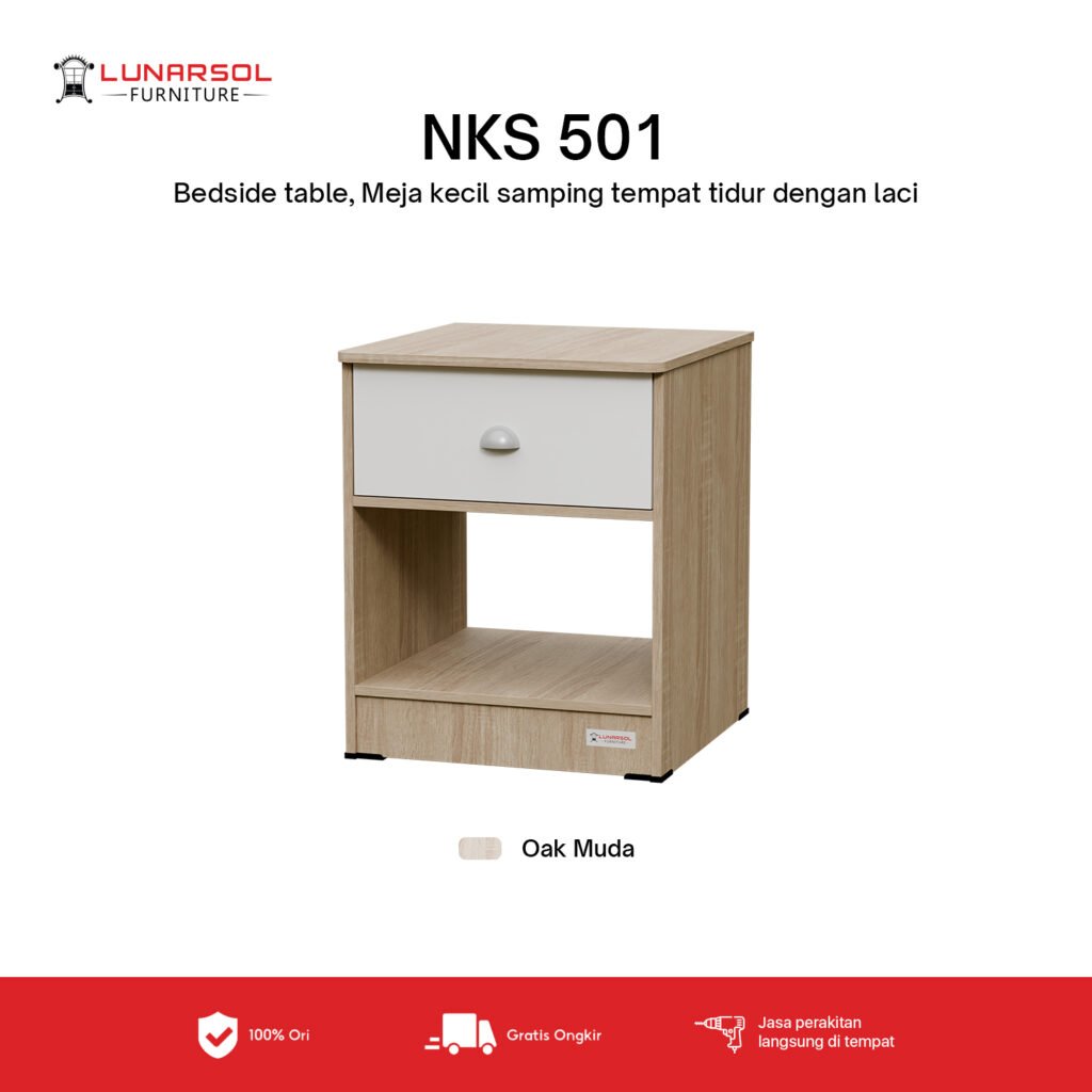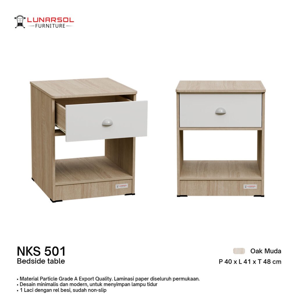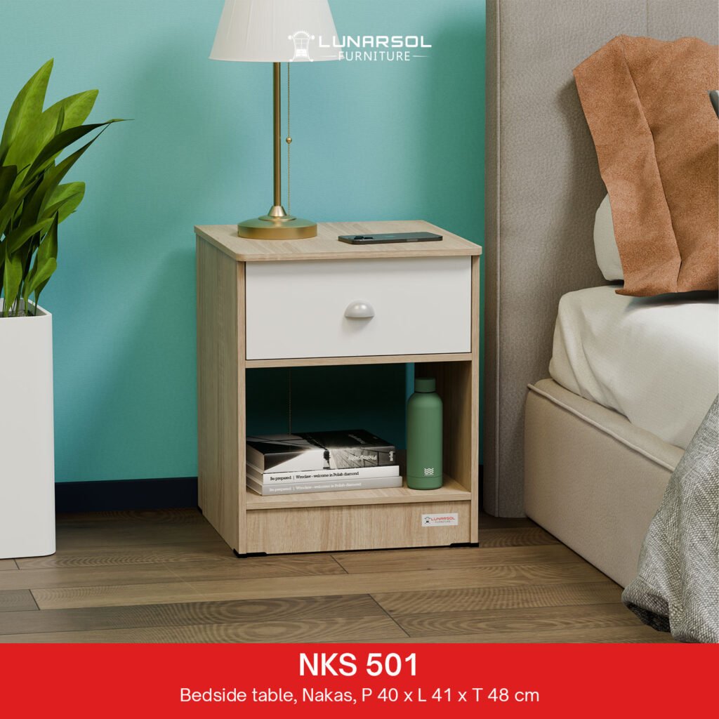 Nakas NKS 501 adalah meja samping tempat tidur yang sempurna, memadukan fungsionalitas dan estetika minimalis untuk melengkapi kamar tidur modern Anda. Dengan desain dua warna yang menawan dan penyimpanan serbaguna berupa laci serta rak terbuka, nakas ini ideal untuk menyimpan barang-barang esensial malam Anda. Material berkualitas ekspor dengan laminasi tahan lama memastikan produk ini tidak hanya indah tetapi juga kokoh dan mudah dirawat.