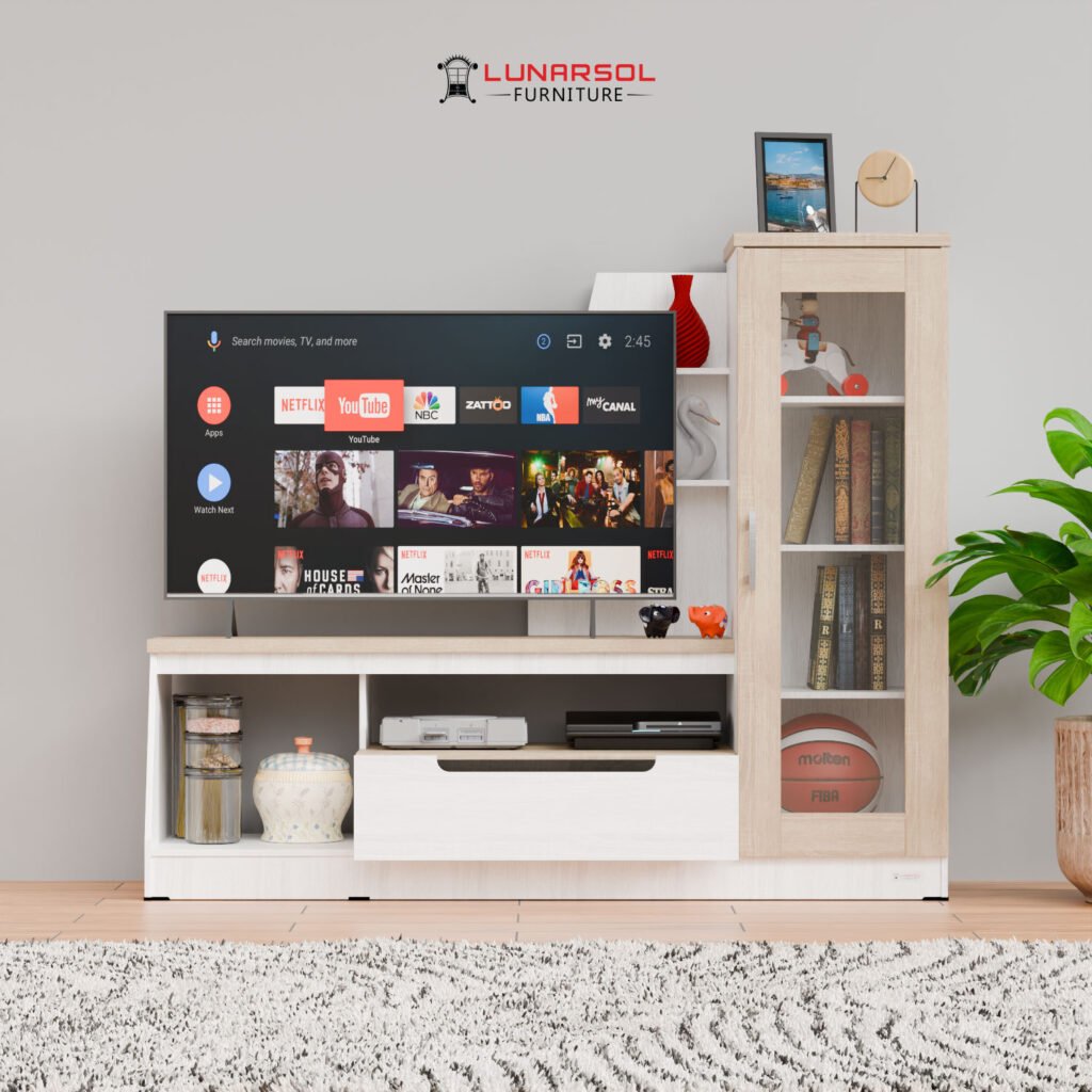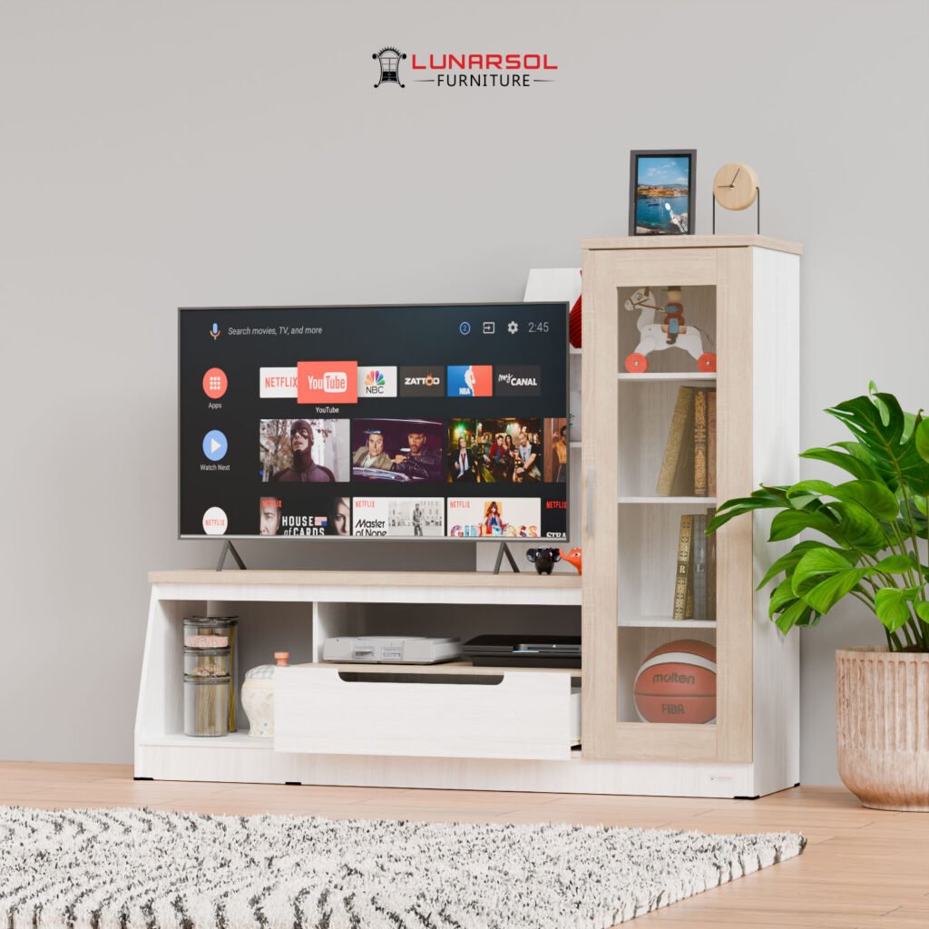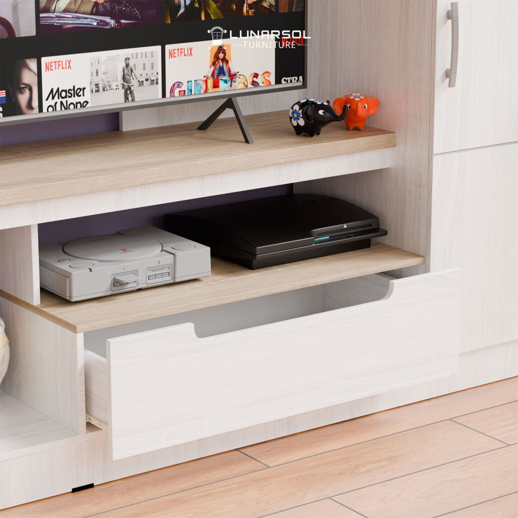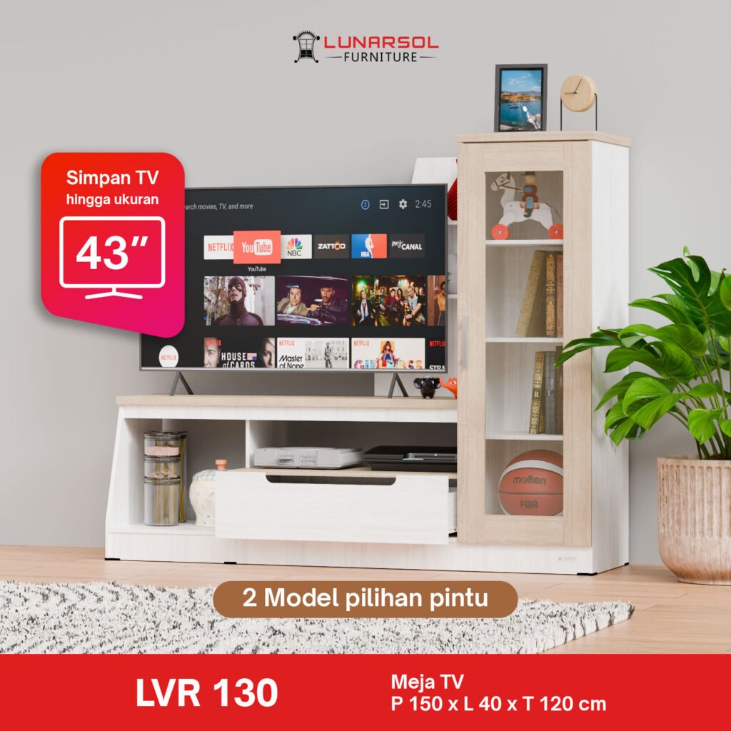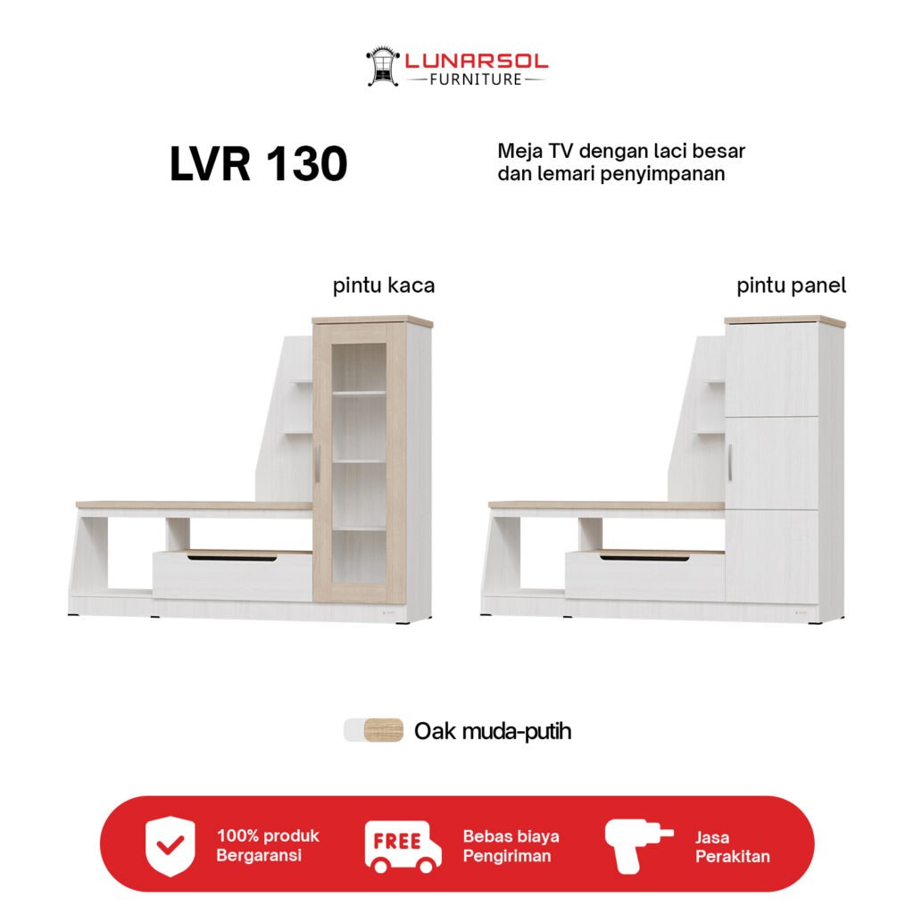 Percantik ruang keluarga Anda dengan Meja TV Minimalis Modern LVR 130 Lunarsol. Didesain untuk TV hingga 43 inci, meja TV ini tampil elegan dengan finishing Oak Muda White dan material Particle Board Export Quality. Dilengkapi rak dan laci penyimpanan fungsional, serta pilihan pintu kaca atau panel. Solusi praktis dan stylish untuk menata hiburan Anda.