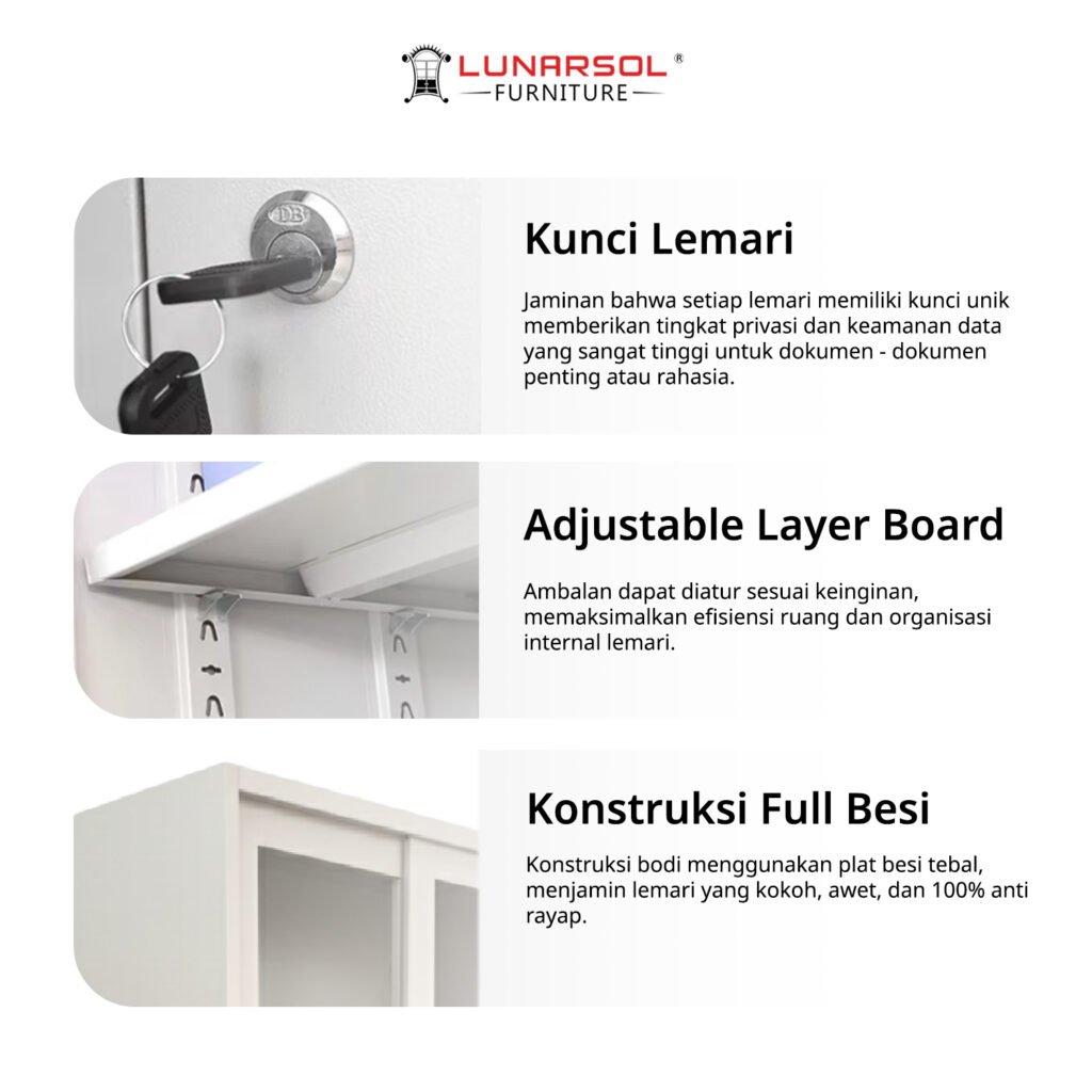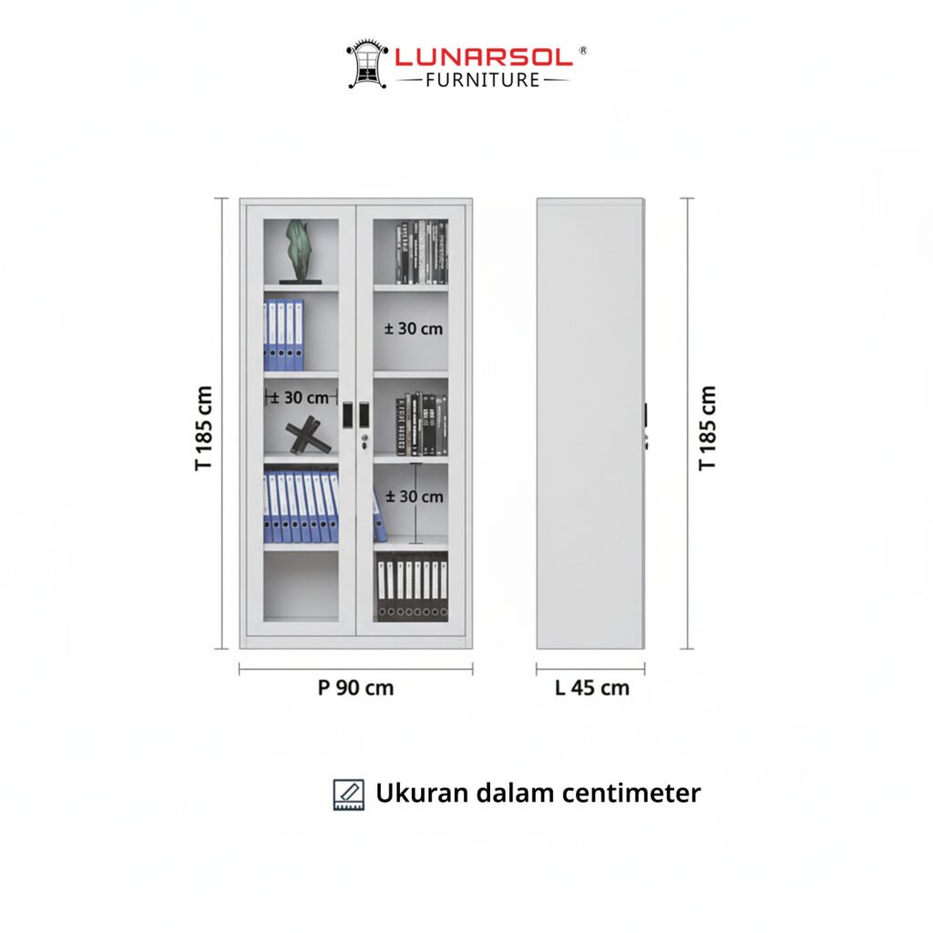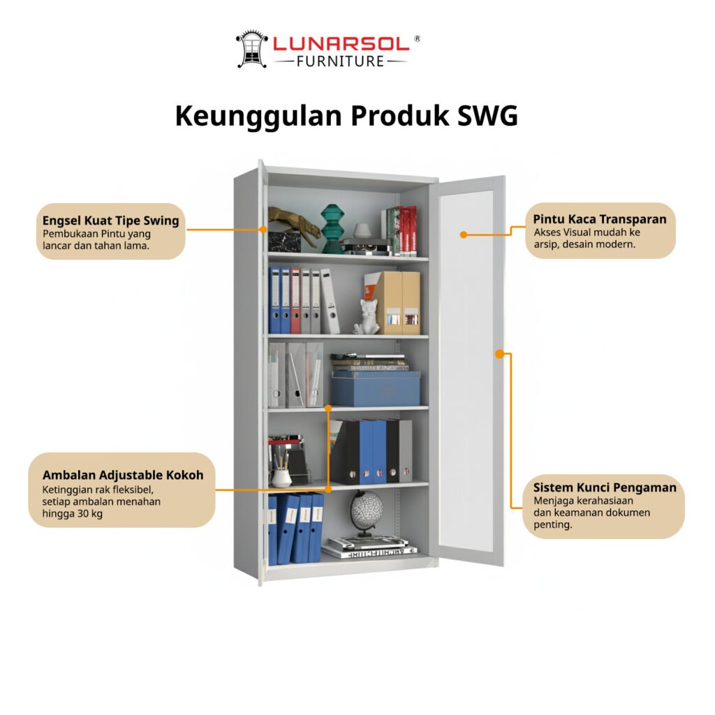 Amankan dan tampilkan arsip penting Anda dengan lemari arsip besi pintu kaca LUNARSOL SWG. Dirancang untuk menggabungkan keamanan dengan estetika modern, lemari ini ideal untuk kantor, sekolah, atau ruang display.