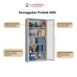 Lemari SWG dilengkapi dengan sistem kunci pengaman untuk menjaga kerahasiaan dokumen. Di dalamnya terdapat 4 susun ambalan yang kuat dan dapat diatur ketinggiannya (Adjustable Layer Board), dengan setiap ambalan mampu menahan beban hingga 30 kg.