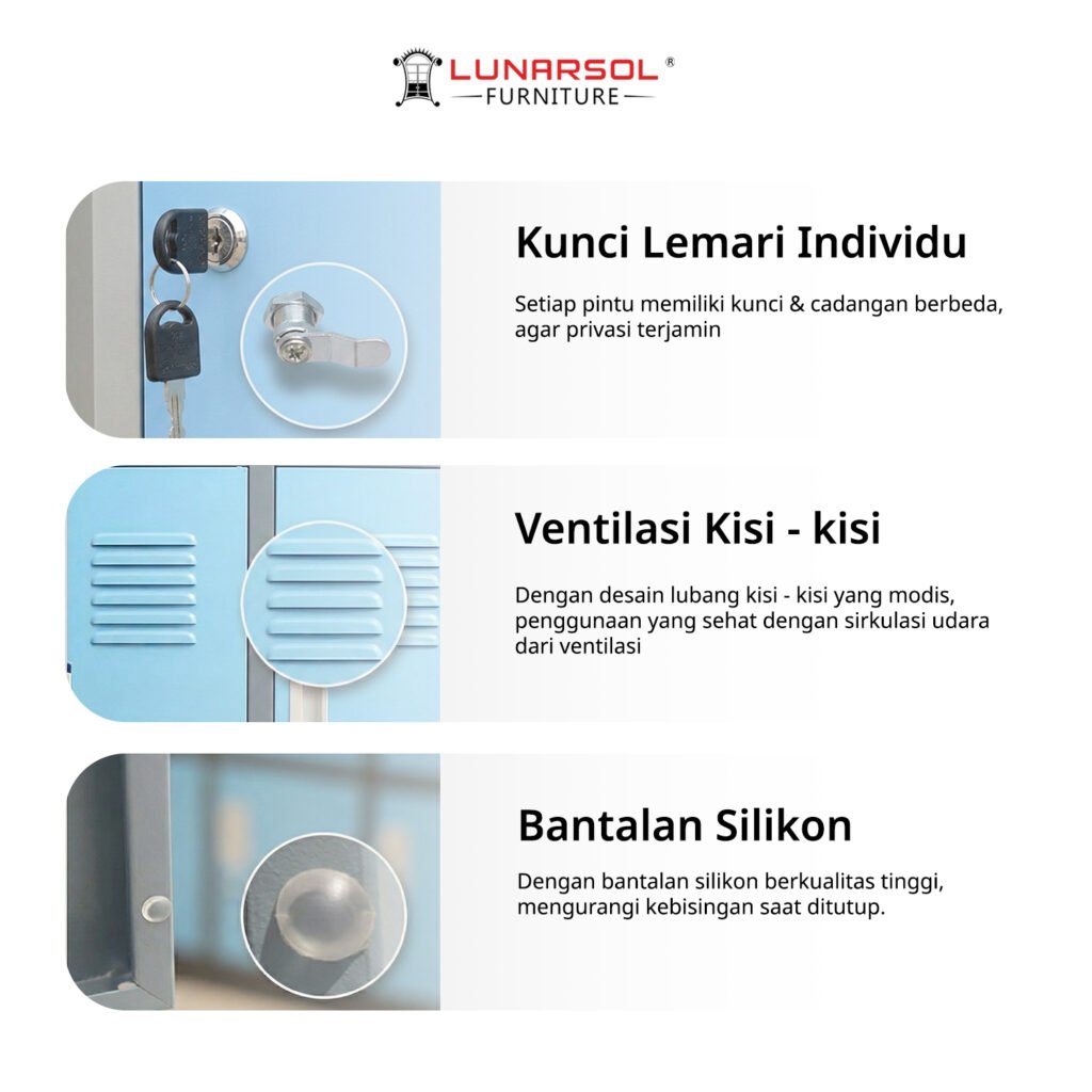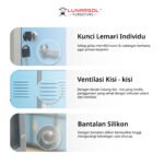 Setiap pintu dilengkapi ventilasi kisi-kisi yang modis untuk mencegah bau dan kelembapan di dalam locker. Slot kartu nama/nomor juga tersedia untuk mempermudah identifikasi pengguna.