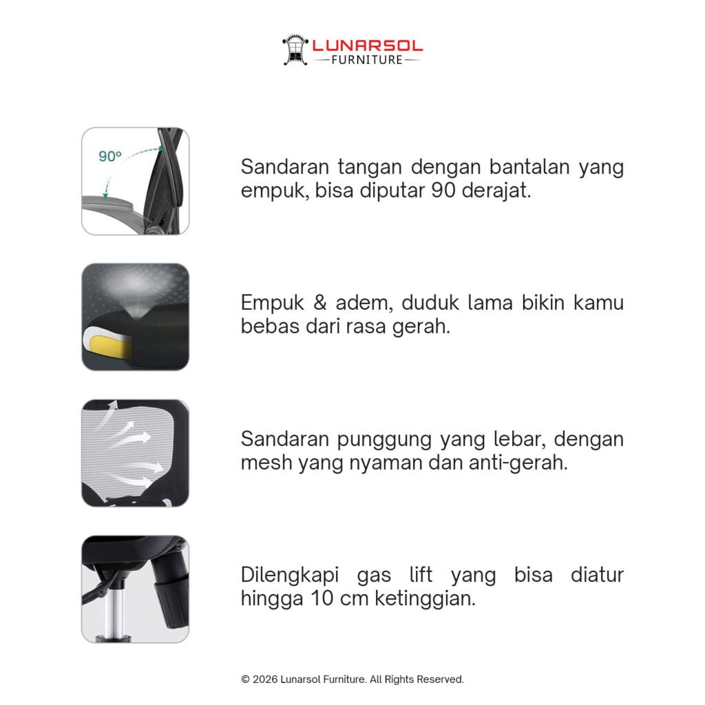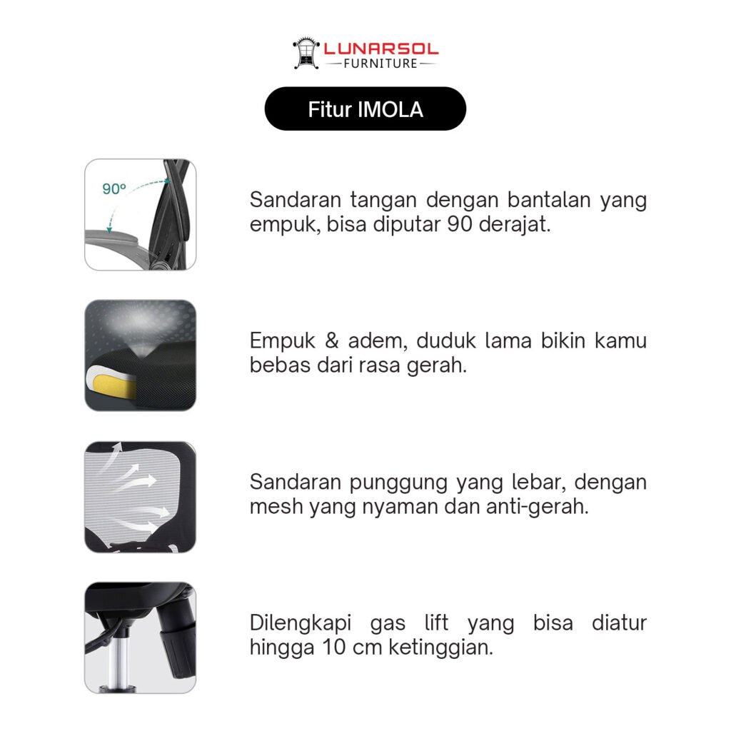 Kursi kantor LUNARSOL IMOLA hadir sebagai solusi ergonomis dan multifungsi untuk menunjang produktivitas Anda sepanjang hari. Dengan desain modern dan fitur-fitur yang dapat disesuaikan, kursi ini menawarkan kenyamanan superior untuk berbagai aktivitas kerja.