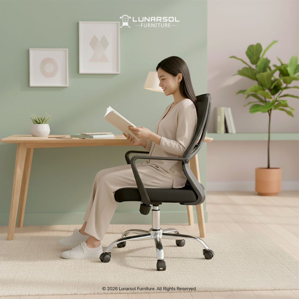 Kursi kantor LUNARSOL KJM 06 adalah pilihan ergonomis dan modern untuk ruang kerja Anda, dirancang untuk memberikan kenyamanan maksimal sepanjang hari. Dengan desain minimalis dan fungsional, kursi ini dilengkapi dengan fitur-fitur yang mendukung postur tubuh ideal dan stabilitas.