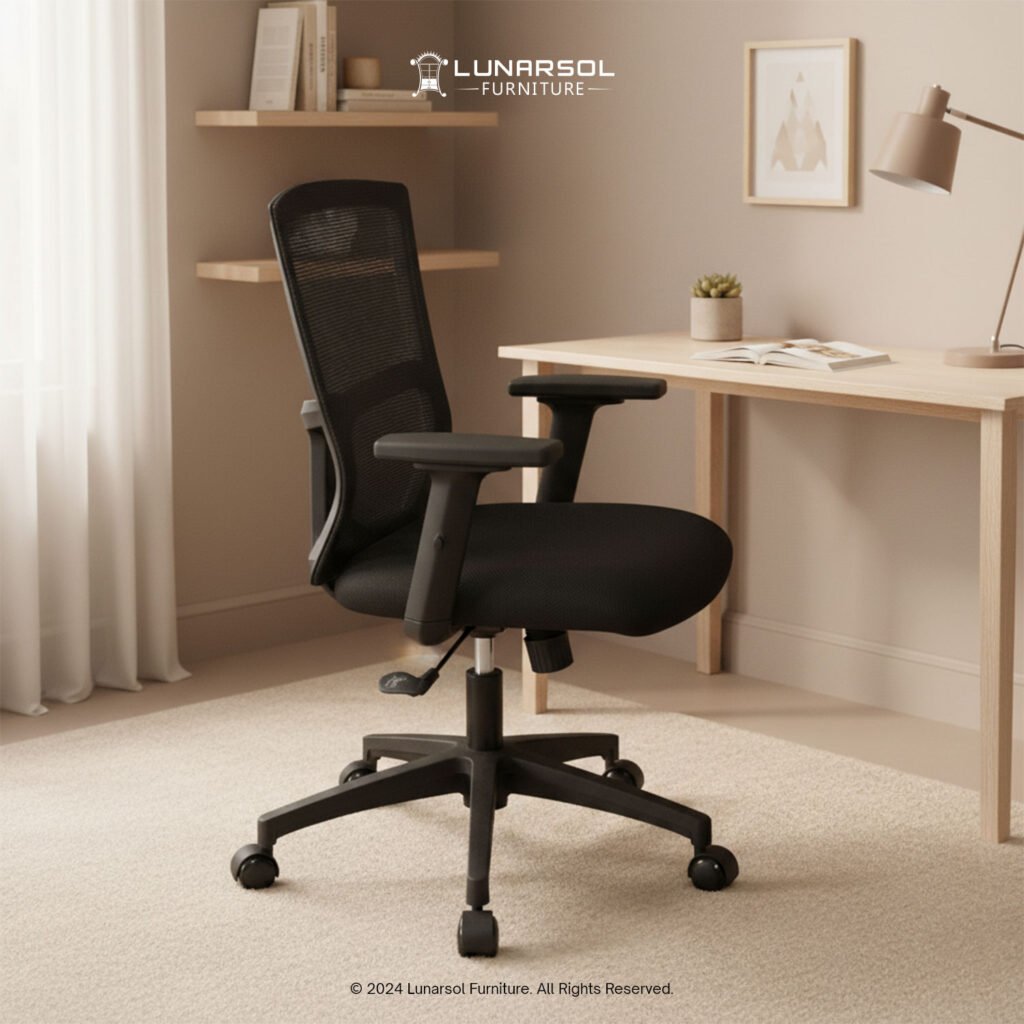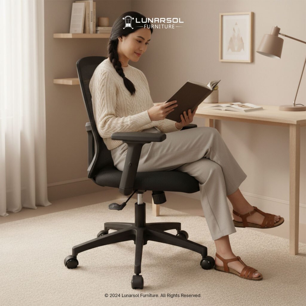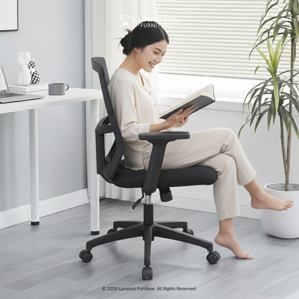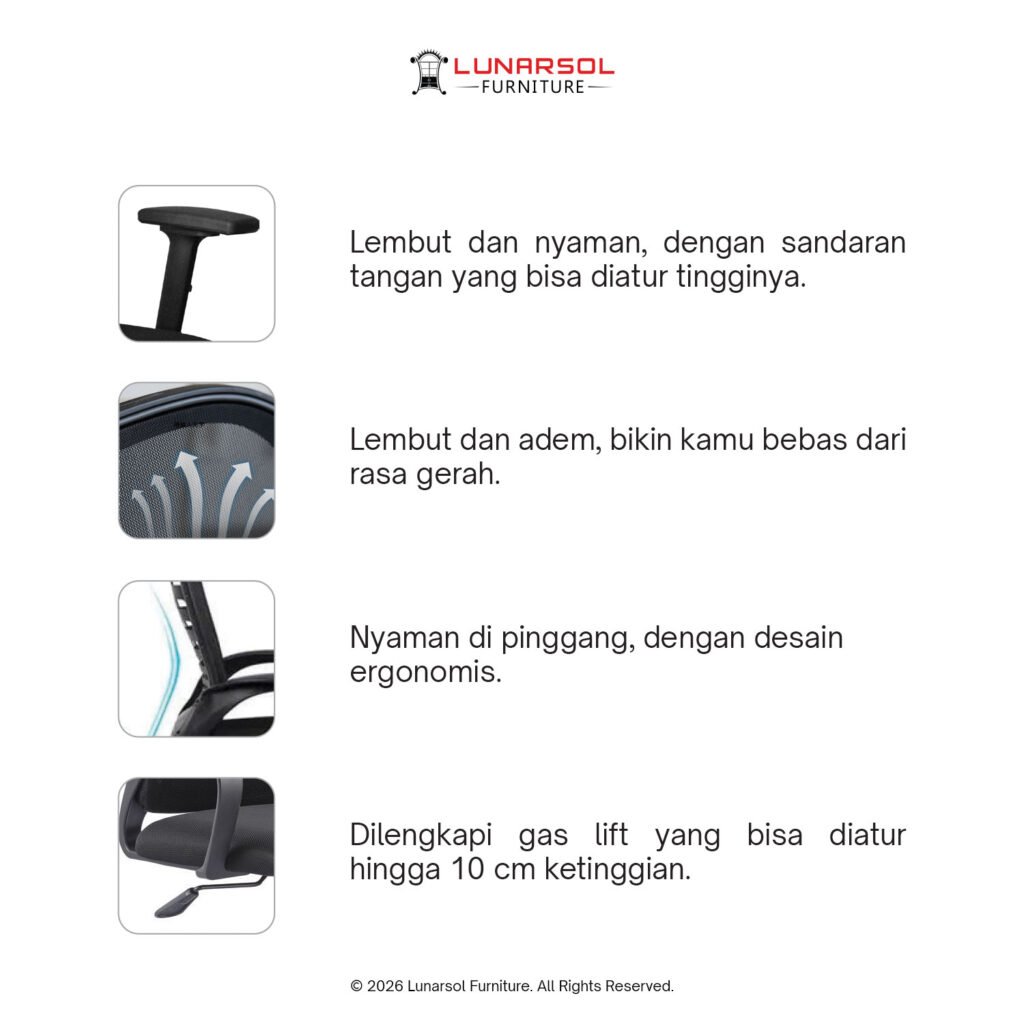 Kursi kantor LUNARSOL KM 800 adalah pilihan ergonomis dan modern untuk ruang kerja Anda, dirancang untuk memberikan kenyamanan maksimal sepanjang hari. Dengan desain minimalis dan fungsional, kursi ini dilengkapi dengan fitur-fitur yang mendukung postur tubuh ideal dan stabilitas.