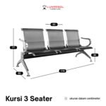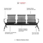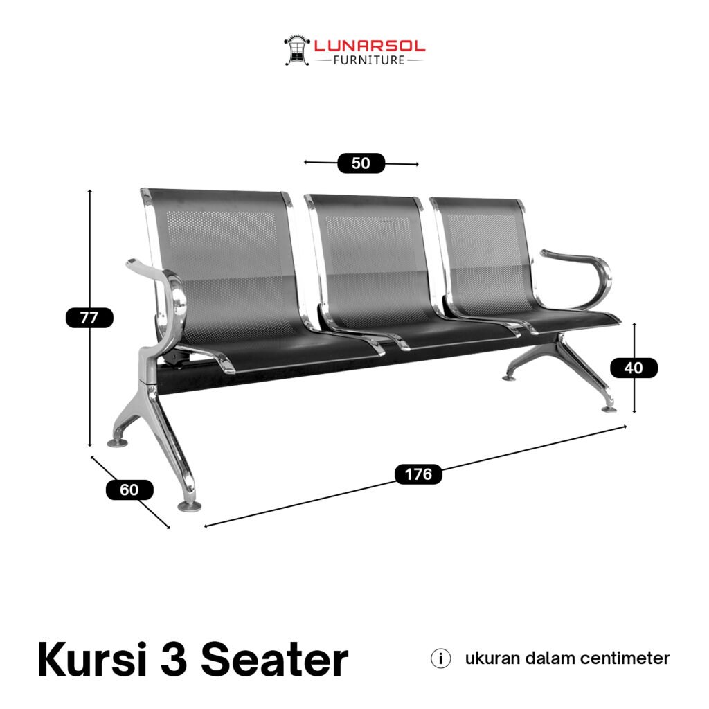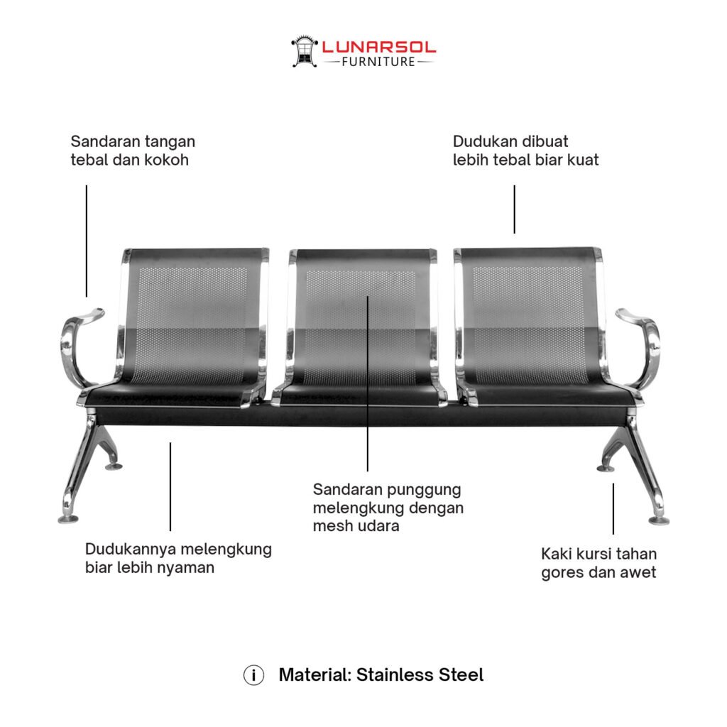 Kursi ruang tunggu 3 seater ini dibuat dengan rangka, tempat duduk, dan sandaran full besi yang kokoh dan berkualitas tinggi. Material besi yang digunakan telah melalui proses anti karat (anti-korosi), memastikan kursi ini memiliki ketahanan luar biasa terhadap keausan dan perubahan cuaca. Permukaan full besi ini juga sangat mudah dibersihkan dan dirawat, menjadikannya pilihan higienis untuk area dengan tingkat kunjungan tinggi.