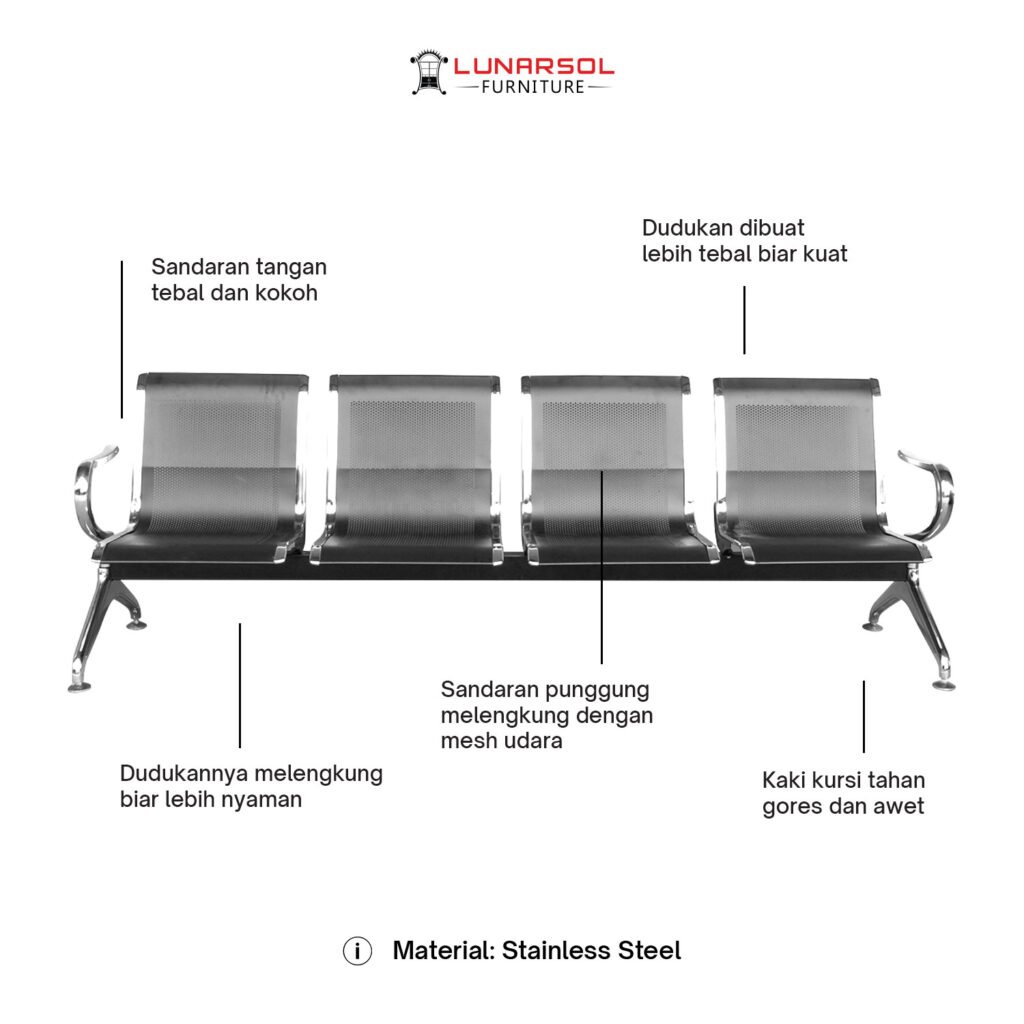 Optimalkan fungsionalitas dan ketahanan ruang tunggu besar Anda dengan kursi ruang tunggu 4 seater besi LUNARSOL C 504. Dirancang dengan desain modern dan elegan, kursi ini sangat ideal untuk area publik seperti bandara, stasiun, aula, atau kantor besar.