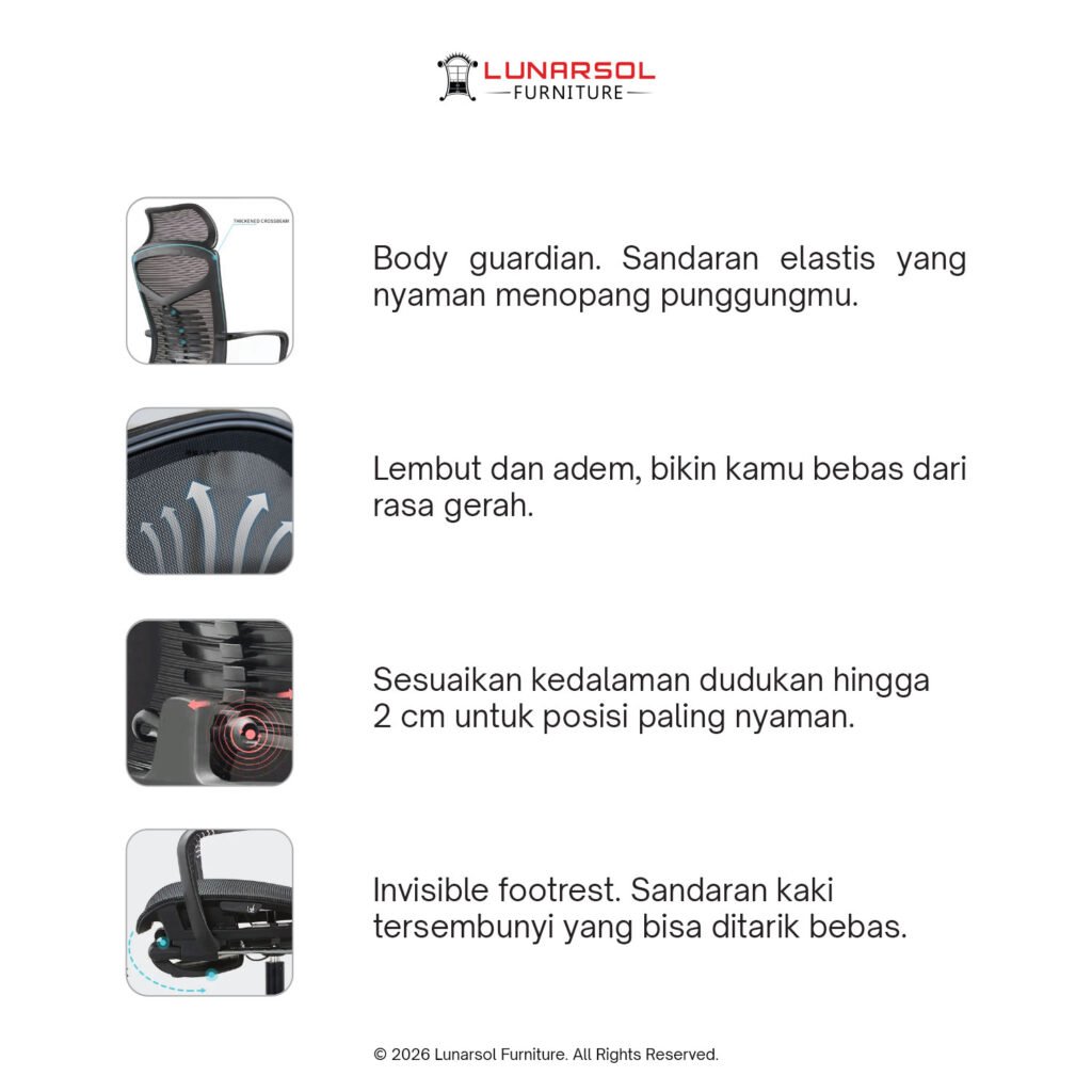 – Sandaran punggung dengan jaring sirkulasi yang nyaman dan dukungan ergonomis.