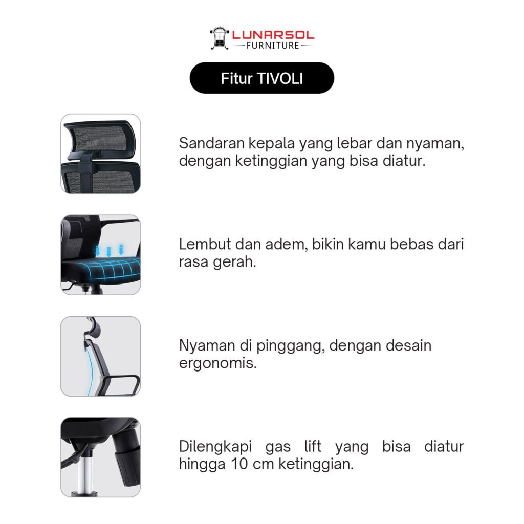 Kursi kantor LUNARSOL TIVOLI adalah pilihan sempurna untuk melengkapi ruang kerja atau kantor Anda, menawarkan kombinasi desain modern, ergonomi superior, dan fitur-fitur yang dapat disesuaikan untuk kenyamanan maksimal sepanjang hari. Tersedia dalam pilihan dengan atau tanpa headrest, kursi ini dirancang untuk mendukung postur tubuh ideal dan sirkulasi udara yang baik.