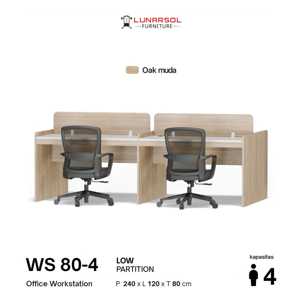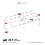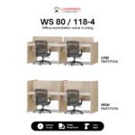 • Varian WS 80 (Low Partition): Menggunakan sekat setinggi 29 cm di atas meja, memberikan kesan terbuka dan memudahkan kolaborasi visual antar rekan kerja.