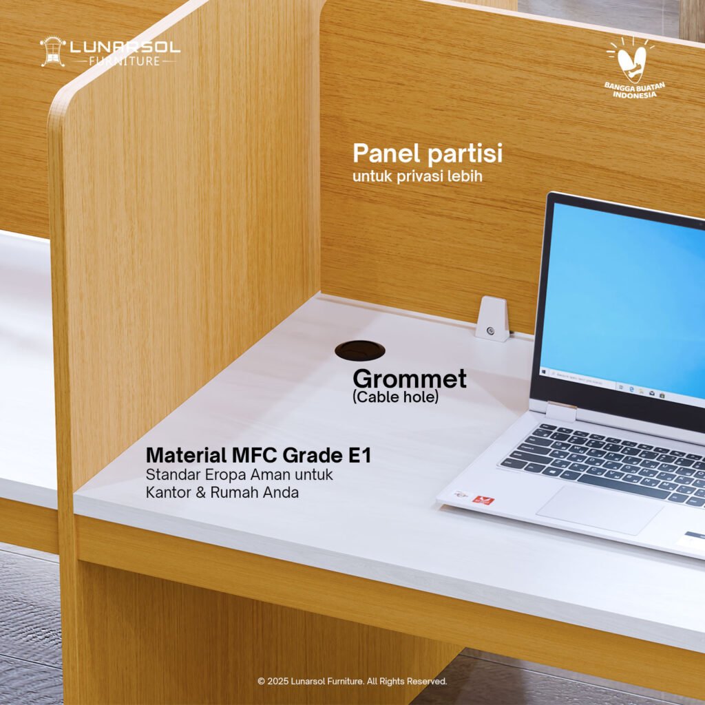 • Fitur: Lubang jalur kabel (Grommet) terintegrasi pada setiap meja.