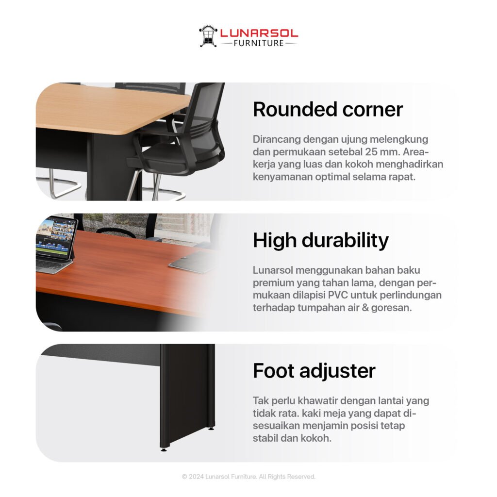– Rounded Corner: Dirancang dengan ujung melengkung dan permukaan setebal 25 mm. Area kerja yang luas dan kokoh menghadirkan kenyamanan optimal selama rapat.