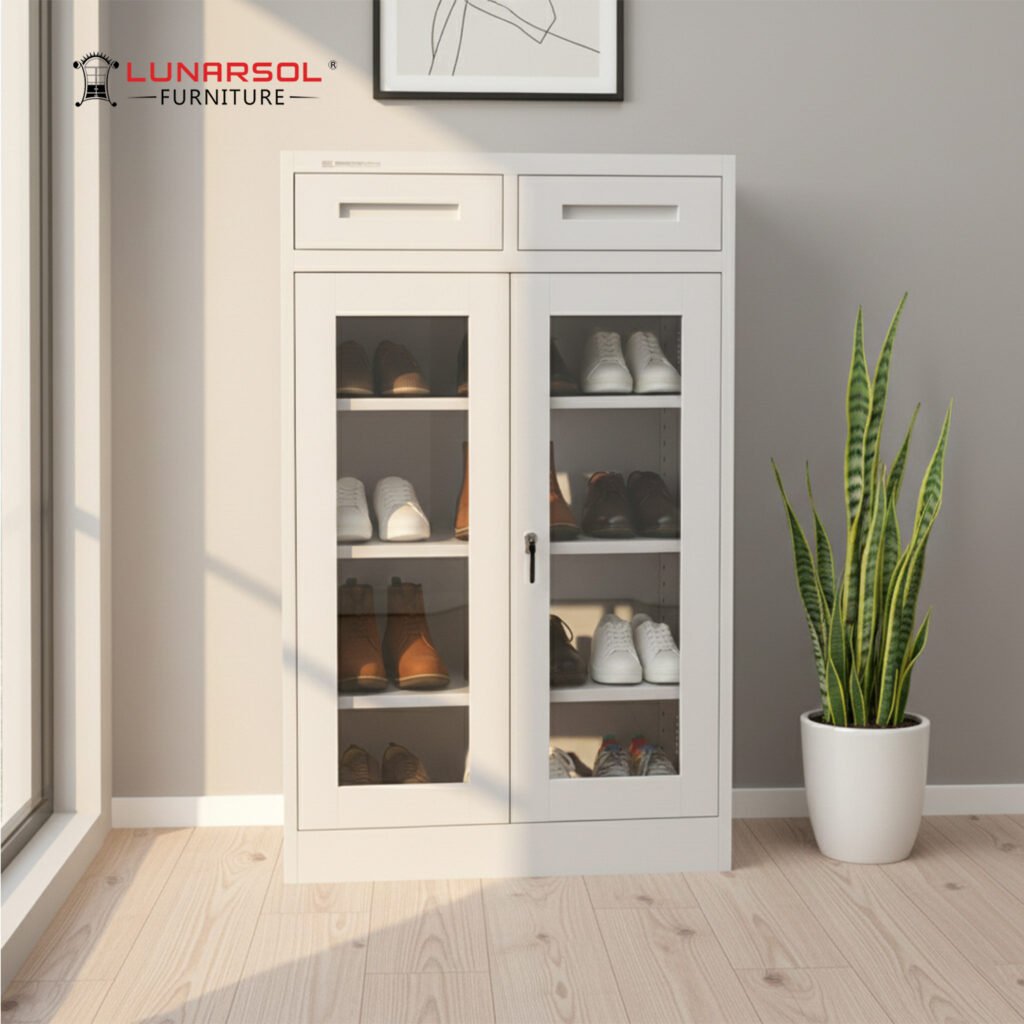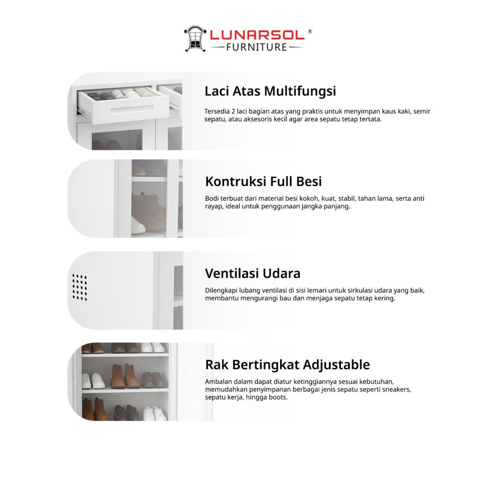 Jaga koleksi sepatu kesayangan Anda tetap rapi, bersih, dan bebas jamur dengan rak sepatu besi LUNARSOL SR 801. Tidak seperti rak kayu yang mudah lapuk, lemari sepatu ini dibuat dari material Full Plat Besi yang menjamin ketahanan mutlak terhadap rayap, air, dan kelembapan.